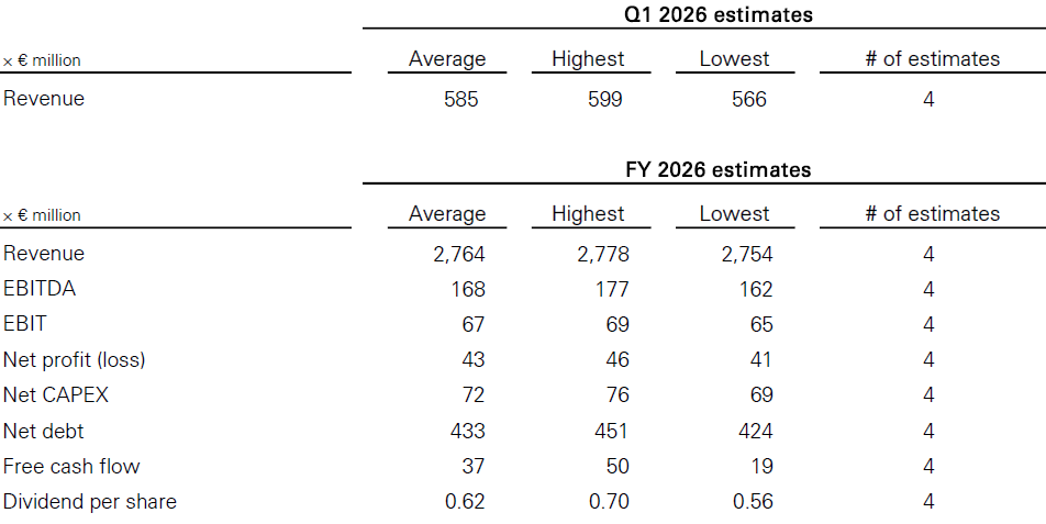 The estimates and any related opinions, forecasts, projections, predictions or expectations, are the sole responsibility of the analysts concerned. Sligro Food Group N.V. has not commented on nor verified any (individual) estimates and it does not express any opinion on nor endorses the estimates or their correctness and accuracy in any way. Sligro Food Group N.V. accepts no liability in respect of the analyst consensus and undertakes no obligation to provide updates or revisions.